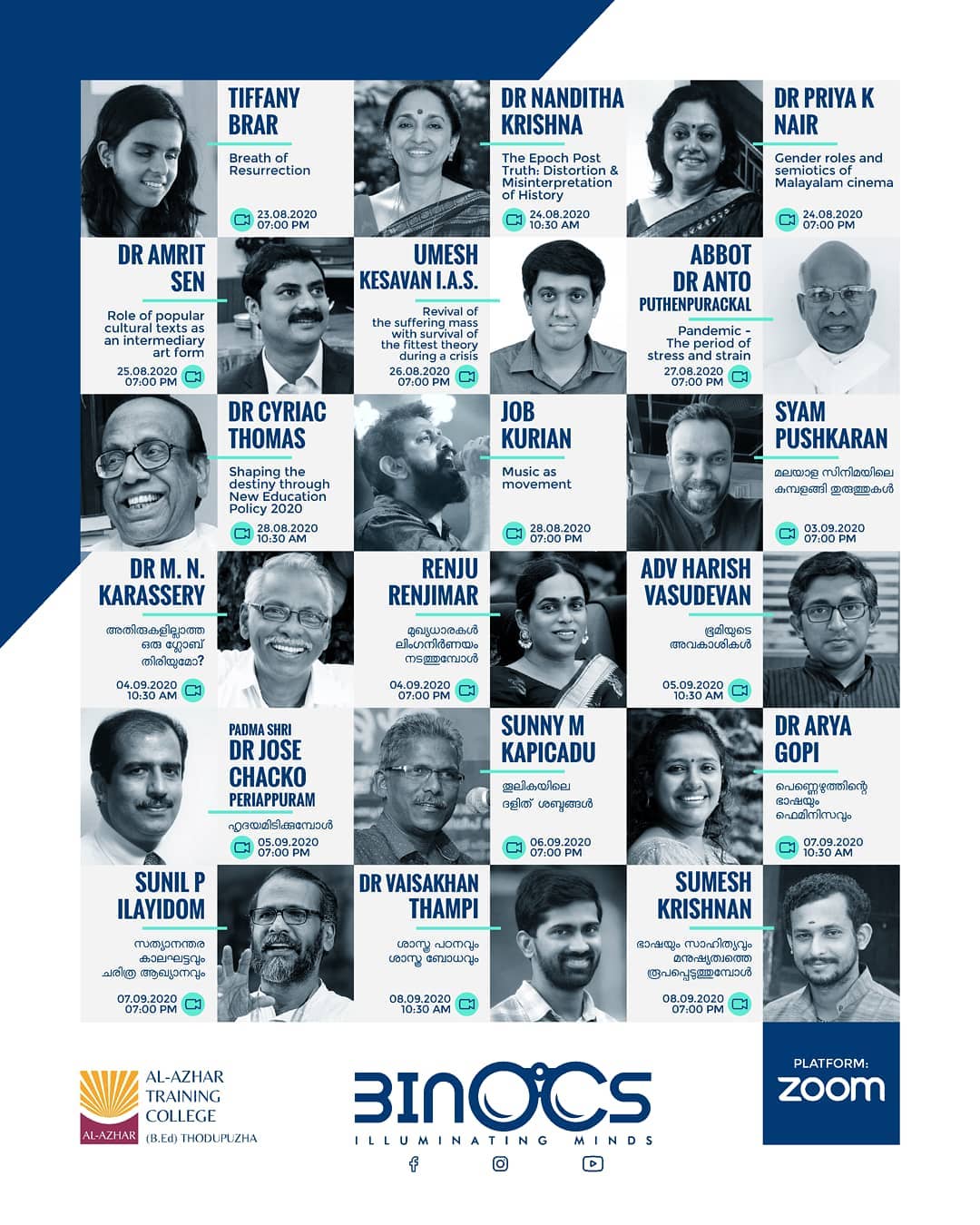 BINOCS 2020 was a national webinar festival held by Al-Azhar Training College aimed to ensure the confluence of art, culture, literature, science and Psychology. The webinar was endowed with 18 renowned speakers across our nation including but not limited to Tiffany Brar, Dr Nanditha Krishna, Dr Amrit Sen etc. The program saw a turn over of 1500+ participants from 18 states who represented more than 400 colleges.